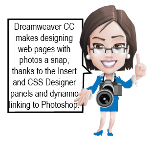 This page is an example of what you can do with images in Dreamweaver CC. The insert panel offers a few different ways to insert an image. All images are also dynamically linked to Photoshop, so editing is a breeze. The CSS Designer panel and Property Inspector offer various ways to customize the layout and appearance of your images, too.